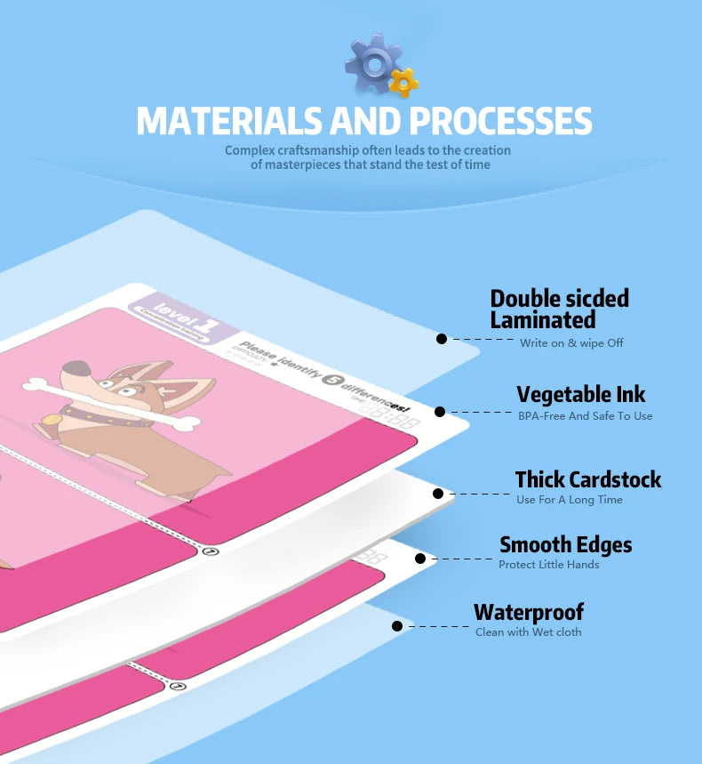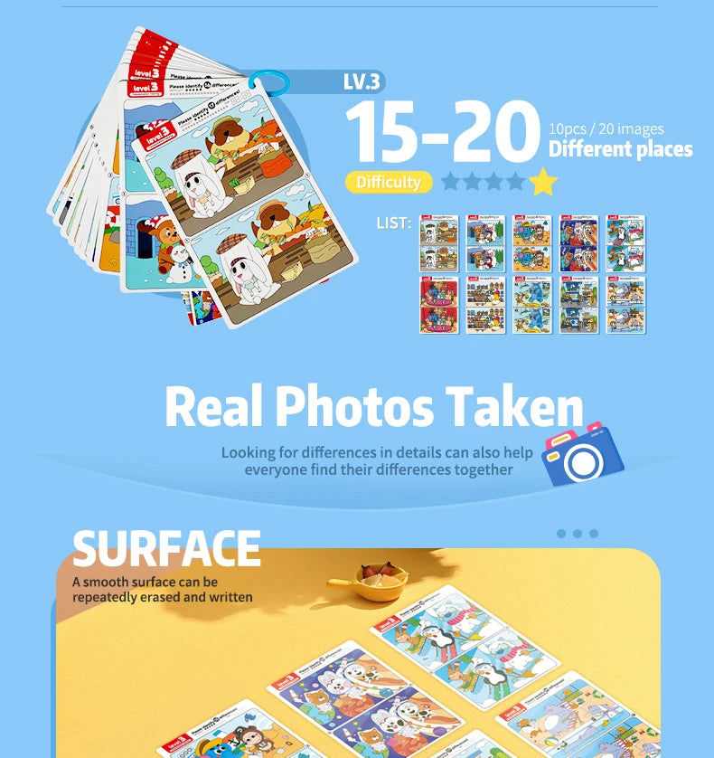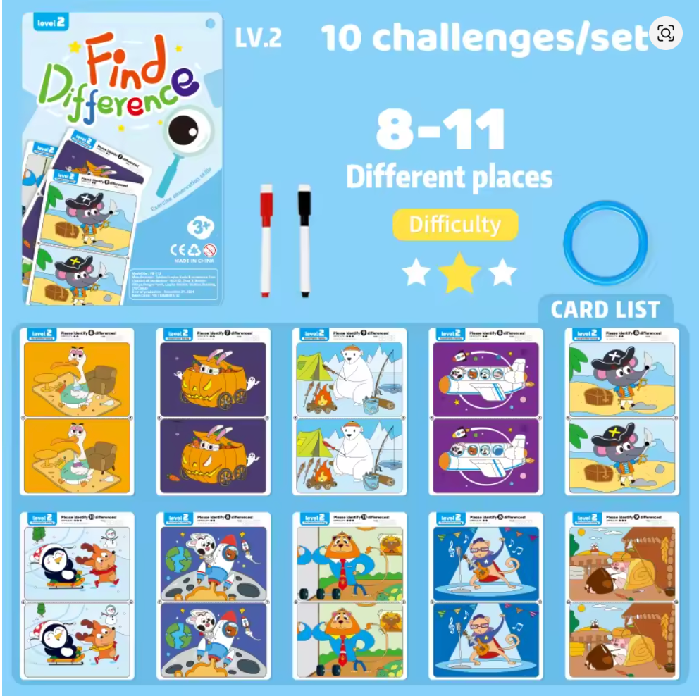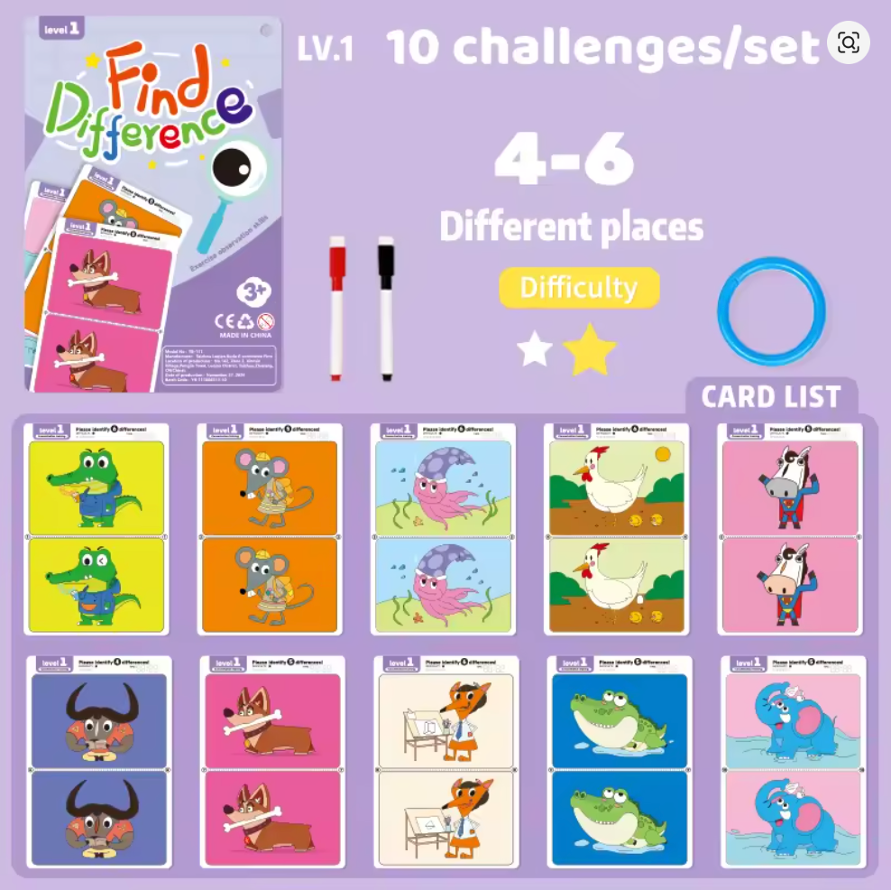 • Format réutilisable et pratique : Livré avec 10 fiches plastifiées et un stylo effaçable, Différenzo peut être rejoué à l’infini, sans gaspillage ni contraintes.